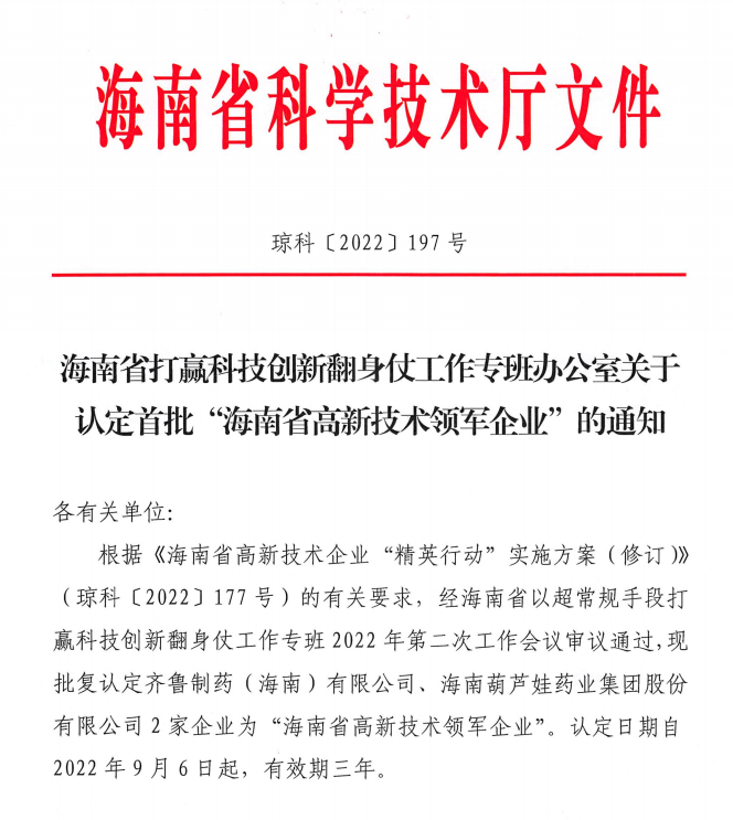 近日,海南省科学技术厅发布的《海南省打赢科技创新翻身仗工作专班办公室关于认定首批“海南省高新技术领军企业”的通知》中显示,批复认定海南ca88亚州城药业集团股份有限公司等2家企业为“海南省高新技术领军企业”。认定日期自2022年9月6日起,有效期三年。