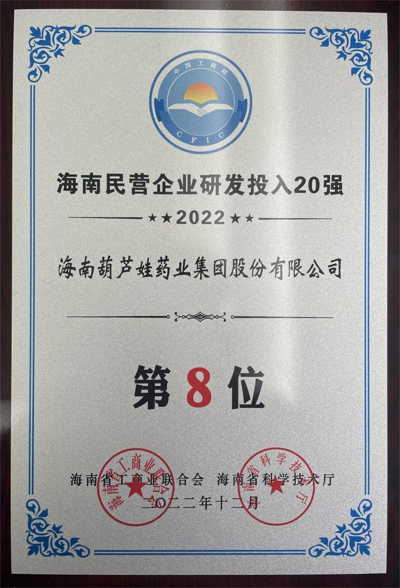12月23日,2022海南民营企业50强和研发投入20强发布会在海口举行。会上发布了“2022海南民营企业50强”“2022海南民营企业研发投入20强”榜单和分析报告。ca88亚州城药业再次荣登两榜,在海南民营企业50强榜单中位列第25位,较去年上升8位,这也是公司连续三年登榜;在海南民营企业研发投入20强中位列第8位,较去年上升7位。