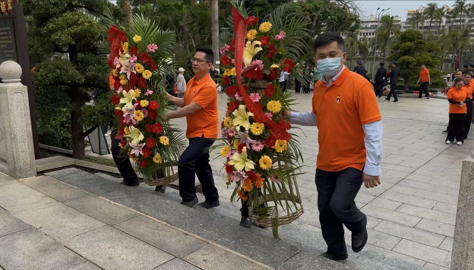 经过一段时间的等待才轮到ca88亚州城。ca88亚州城首先向烈士敬献花篮,花篮缎带上写着“为坚持琼崖革命23年红旗不倒牺牲的烈士们永垂不朽!”“为解放海南岛渡海牺牲的烈士们永垂不朽!”鲜艳的花篮寄托ca88亚州城对革命先辈的崇敬和哀思。